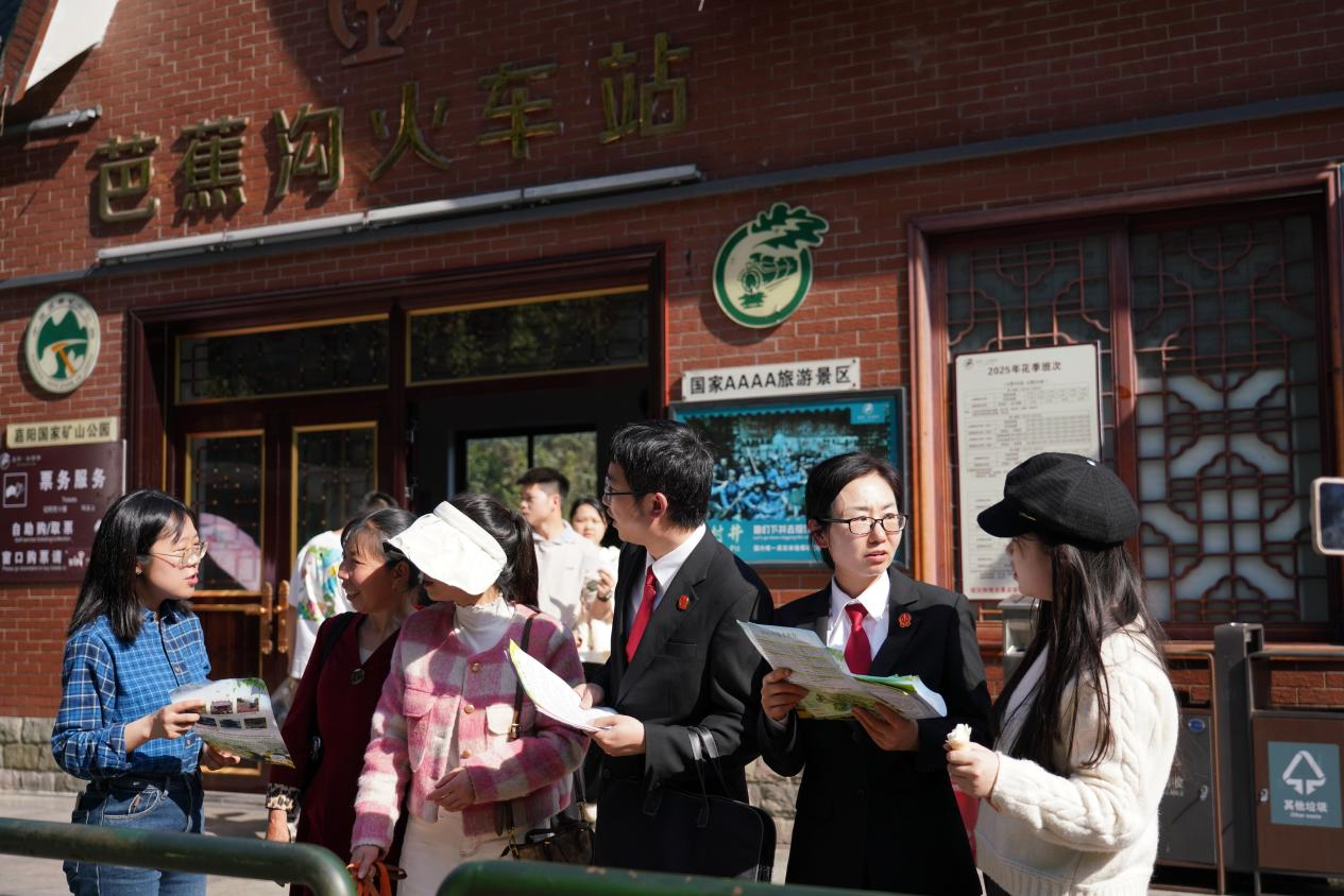 活動當(dāng)天,法官們登上嘉陽小火車,將車廂變?yōu)?/span>“移動普法課堂”,結(jié)合《環(huán)境保護(hù)法》《民法典》中生態(tài)環(huán)境侵權(quán)責(zé)任條款,隨著火車徐徐前進(jìn),向游客們講解環(huán)境污染防治、生態(tài)破壞法律責(zé)任等法律知識,并發(fā)放圖文并茂的普法宣傳冊。