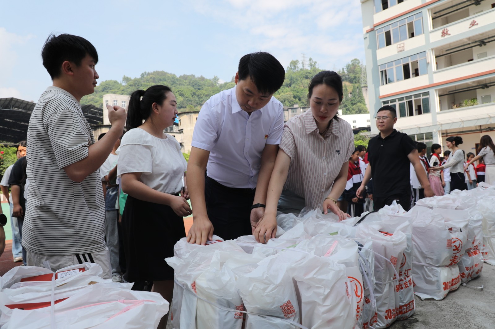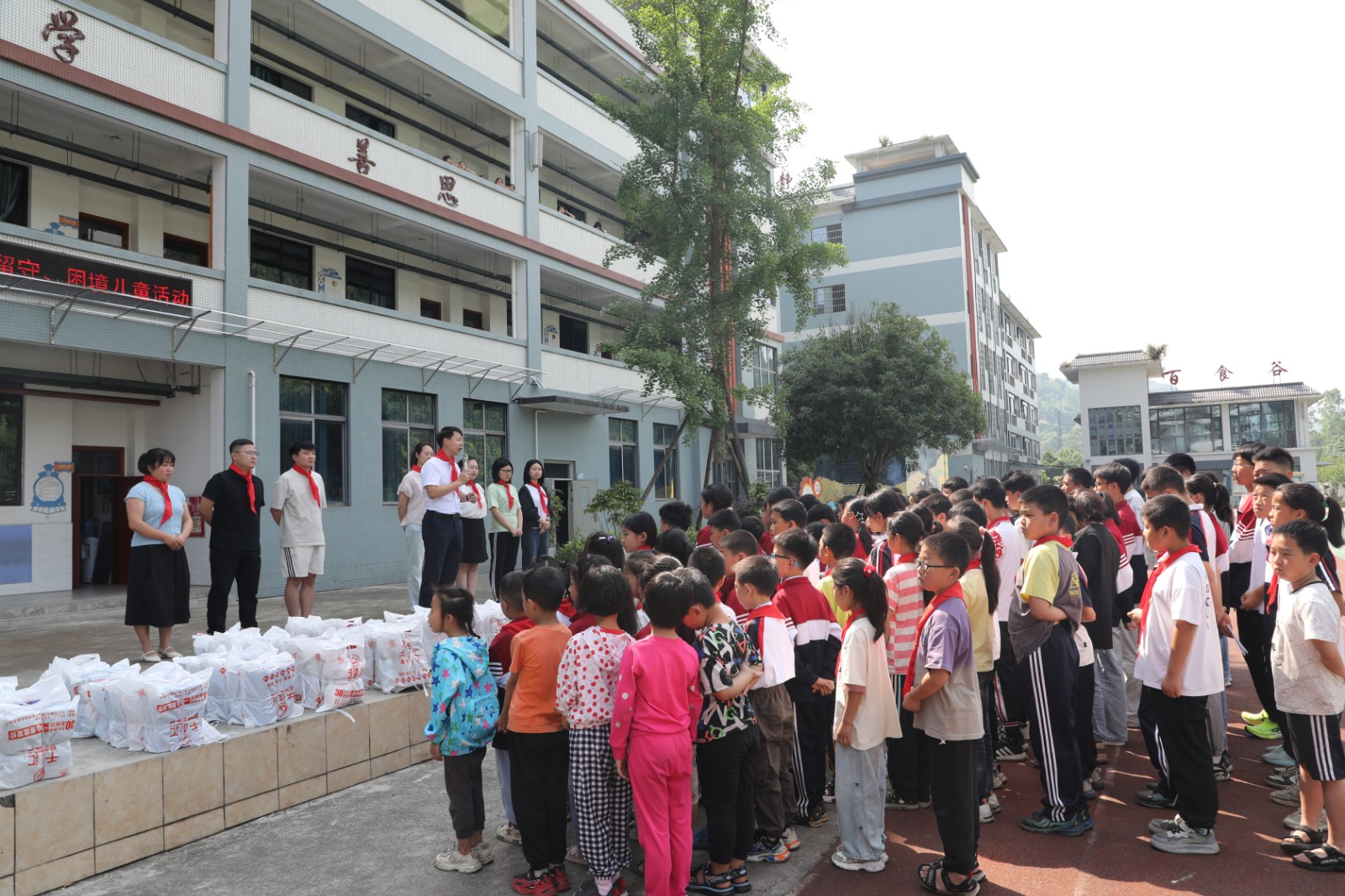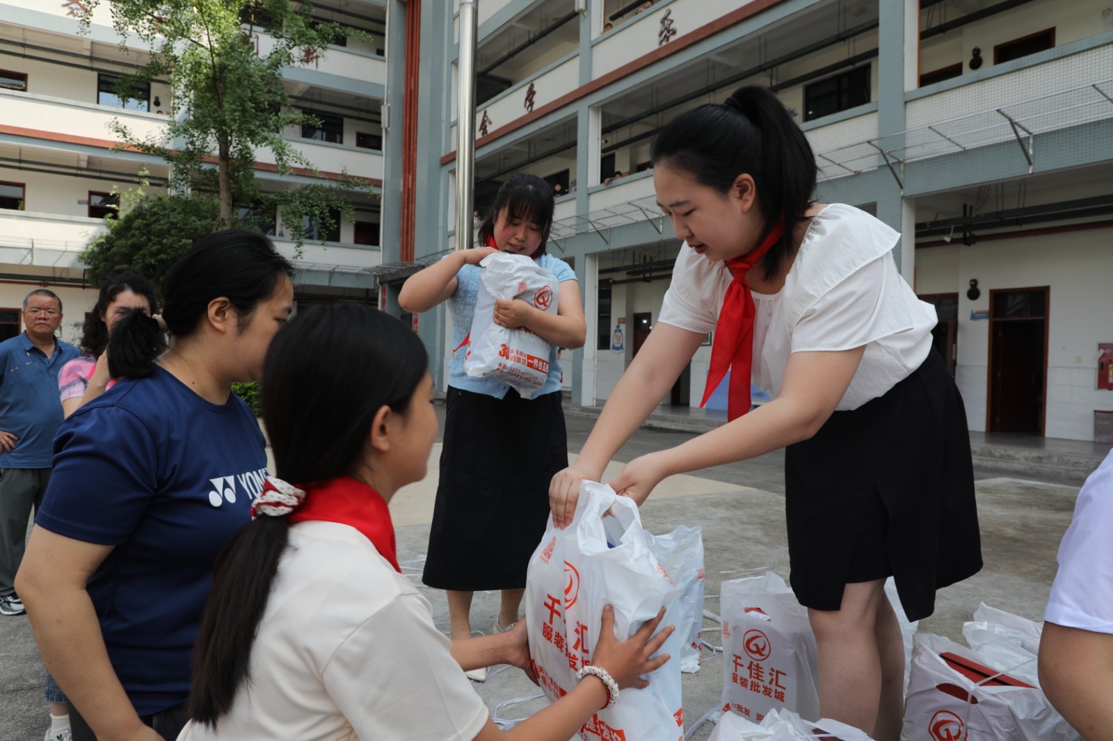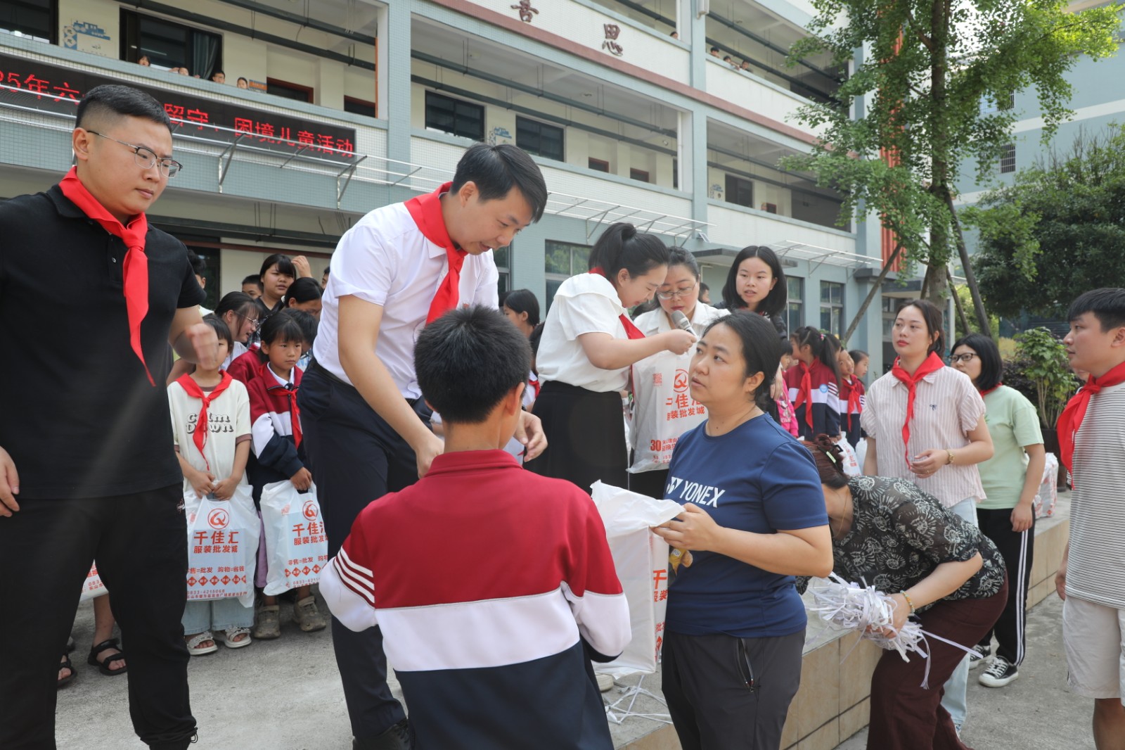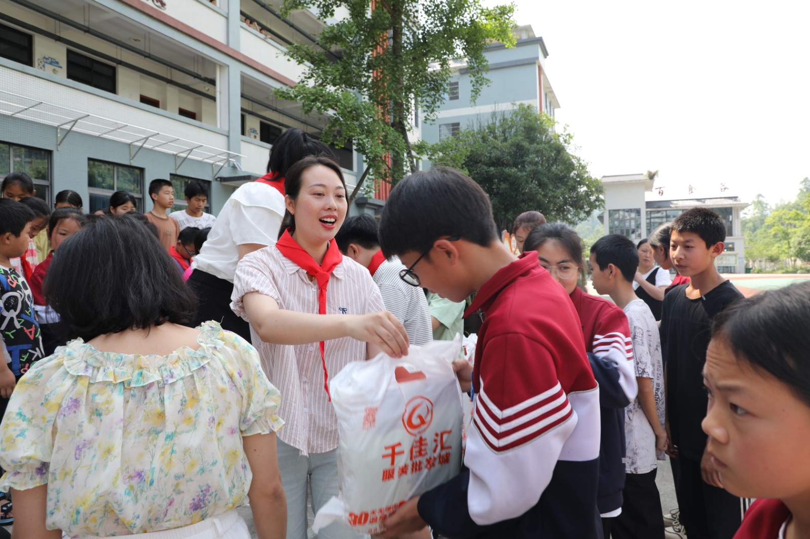 在學(xué)校操場上,公司為學(xué)生們送上了精心準(zhǔn)備的衣服和鞋子。學(xué)生們手捧這份溫暖的“六一”禮物,臉上綻放出幸福的笑容,充滿了童真與歡樂,整個(gè)活動(dòng)現(xiàn)場洋溢著溫馨和諧的氛圍。