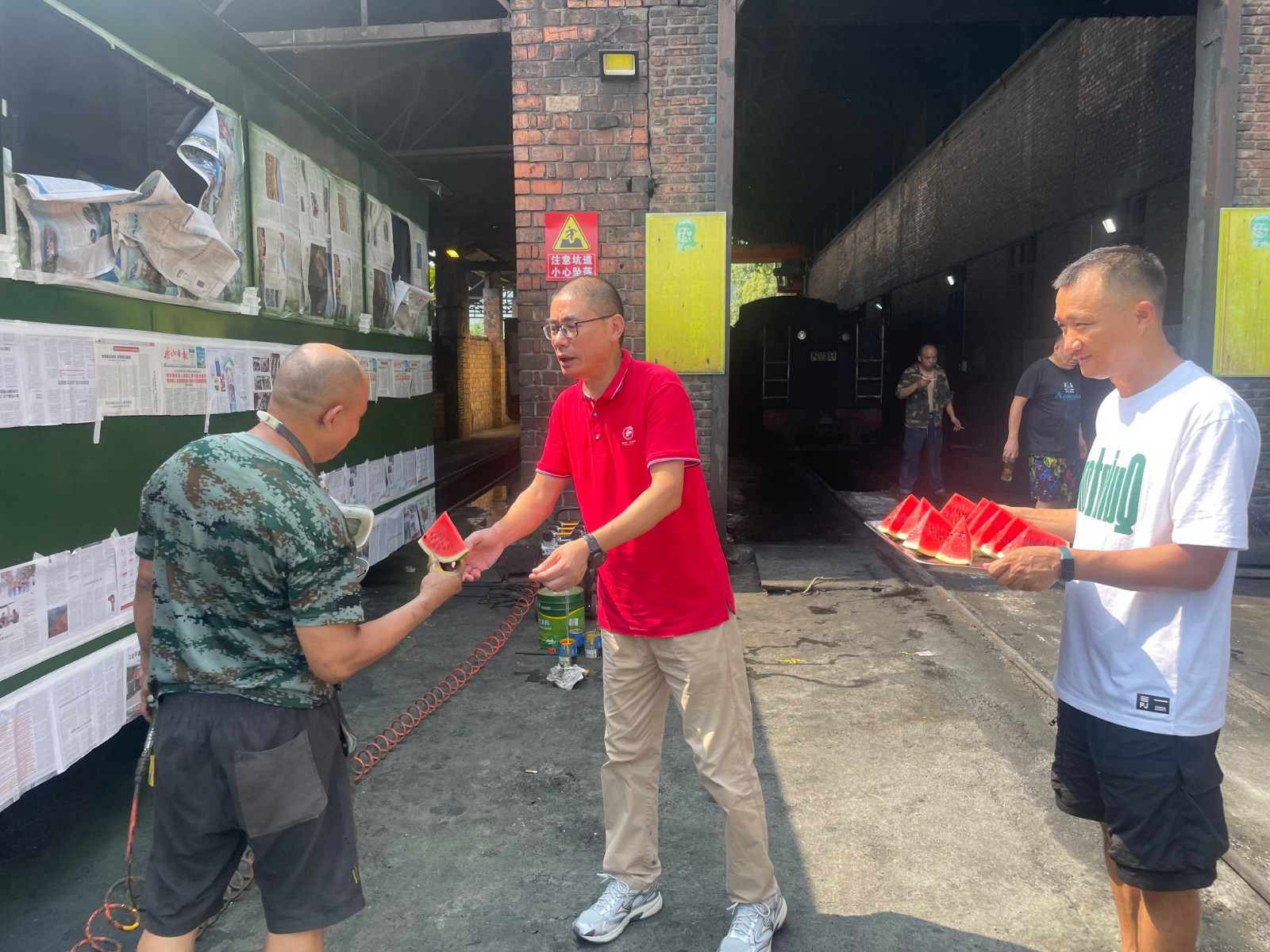 暑假旅游季開啟,嘉陽(yáng)小火車的司機(jī)司爐等高溫崗位人員也面臨一年中最大的一場(chǎng)“烤”驗(yàn),蒸汽火車駕駛室的溫度高達(dá)60-70攝氏度,司爐工還需要不時(shí)的給火車放灰、清理爐膛……為確保小火車的安全正常運(yùn)行,火車運(yùn)營(yíng)管理部合理安排司機(jī)、司爐的作業(yè)時(shí)間保障其安全駕駛,同時(shí)加強(qiáng)火車的維護(hù)檢修、道路隱患排查工作;為了保障一線人員的身體健康,工會(huì)的同志精心準(zhǔn)備了“清涼禮包”,每天為出車司機(jī)發(fā)放冰凍礦泉水、西瓜等,每星期定期開展送西瓜、冰粉、涼糕活動(dòng),全方位為職工防暑降溫“保駕護(hù)航”。