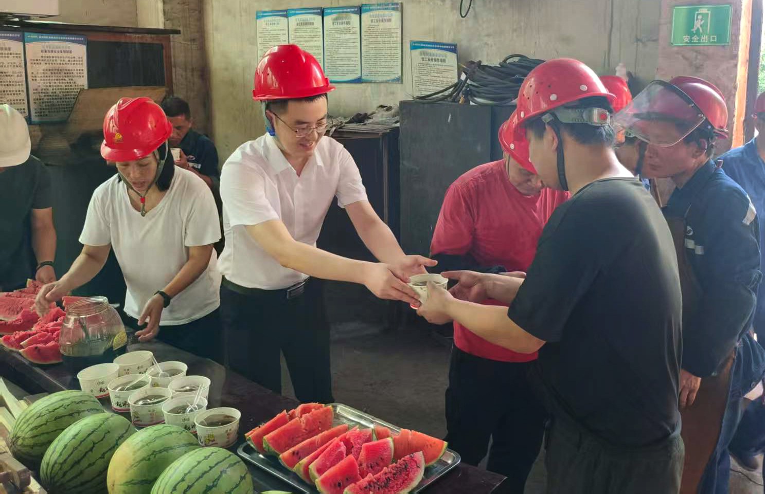 機(jī)關(guān)第四黨支部分別前往宜賓福溪粉煤灰公司和機(jī)電制造維修分公司開展“送清涼、送安全、送祝?!被顒?dòng)。在福溪粉煤灰公司,黨委副書記、工會(huì)主席謝建國(guó)為高溫戰(zhàn)線的職工送上礦泉水和西瓜,叮囑大家注意個(gè)人防護(hù),預(yù)防中暑。謝建國(guó)了解了粉煤灰公司安全生產(chǎn)等多方面的情況,提醒經(jīng)營(yíng)班子關(guān)注夏季高溫對(duì)職工的影響,加強(qiáng)與職工的溝通交流,及時(shí)為職工解難事、辦實(shí)事,確保職工隊(duì)伍穩(wěn)定,助力平安度夏。