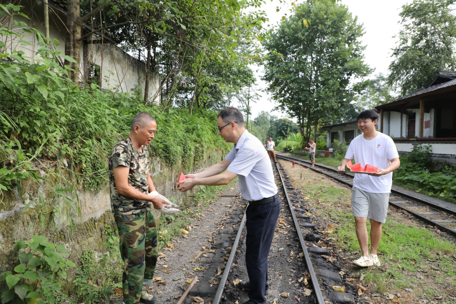 “兄弟們,把手中的活放一放,過來吃口西瓜涼快涼快……”,在火車機(jī)頭、在檢修車間、在芭石鐵路、在黃村井井口、在芭蕉溝花圃……紀(jì)委書記呂明強(qiáng)一邊招呼著火車司機(jī)、檢修工、道班維修工、講解員、花圃養(yǎng)護(hù)工……一邊將切好的西瓜送到他們手中。每到一處,呂明強(qiáng)認(rèn)真了解他們的工作情況,仔細(xì)叮囑他們合理安排作息時(shí)間,盡可能避開高溫時(shí)段在烈日下工作,同時(shí)要準(zhǔn)備好防暑藥品,落實(shí)好防暑措施,防止高溫中暑。