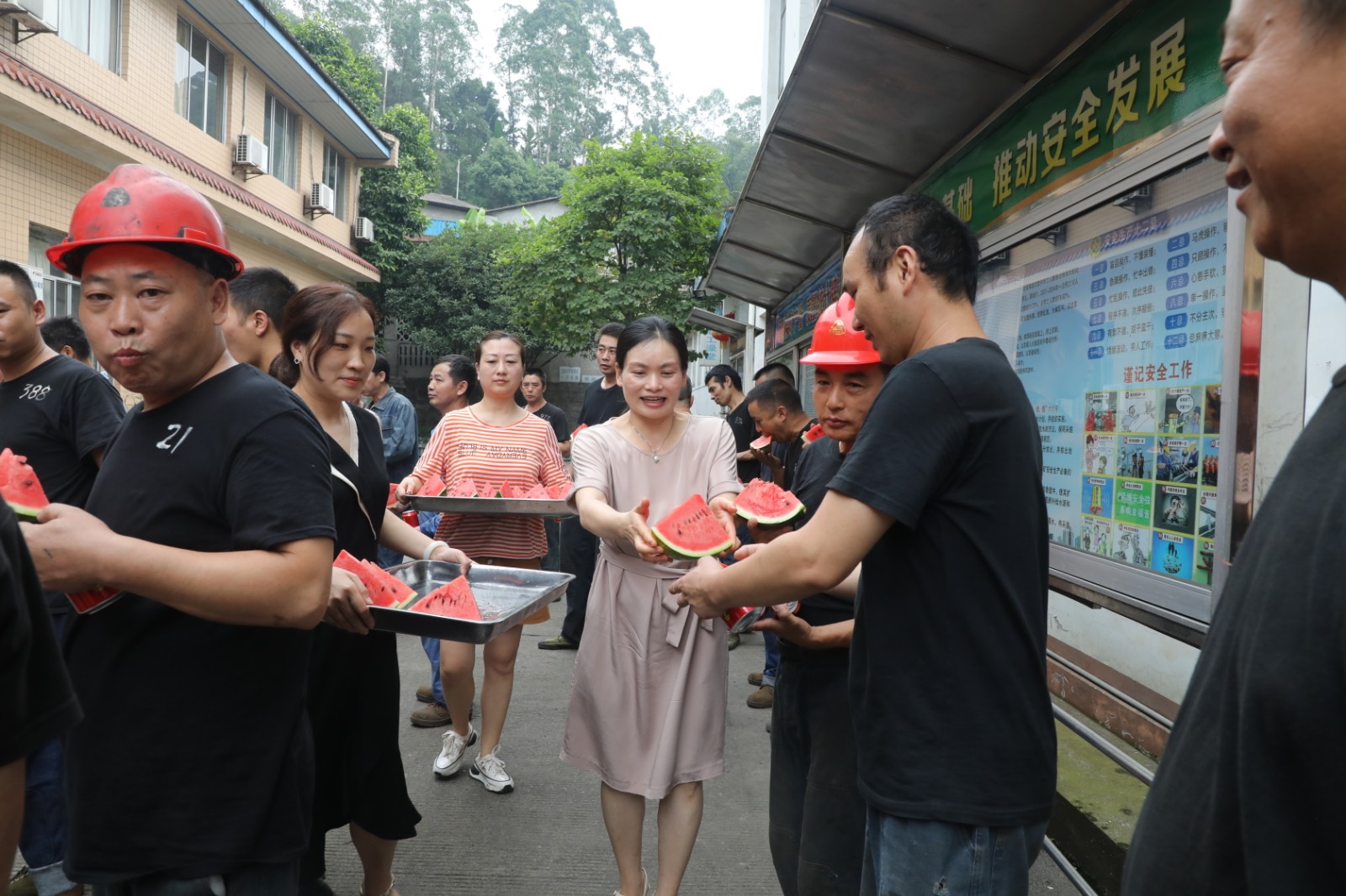 炎炎夏季,驕陽(yáng)似火,酷熱難耐,嘉陽(yáng)煤礦職工依然堅(jiān)守崗位,用他們的汗水為企業(yè)發(fā)展、社會(huì)需求貢獻(xiàn)著自己的力量。“大兄弟,來(lái),吃一塊西瓜涼快涼快”,在嘉陽(yáng)煤礦井口,樂(lè)山市總工會(huì)黨組成員、機(jī)關(guān)黨委書(shū)記張慧一邊招呼著礦工兄弟,一邊把一塊塊切好的西瓜送到礦工們的手中;市總工會(huì)組宣部部長(zhǎng)鮑學(xué)智,主任科員張海濱也忙著將一瓶瓶消暑飲料遞到職工們的手上,叮囑大家在確保安全生產(chǎn)的同時(shí)不忘防暑降溫,絲絲關(guān)愛(ài)源源流進(jìn)職工們的心田。