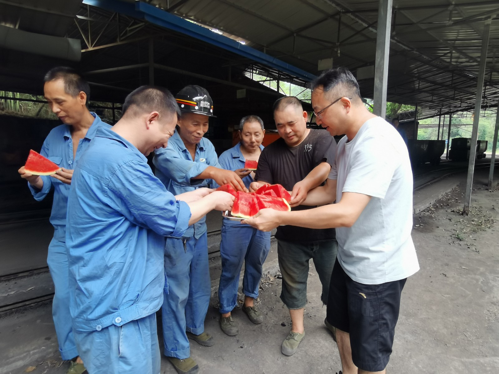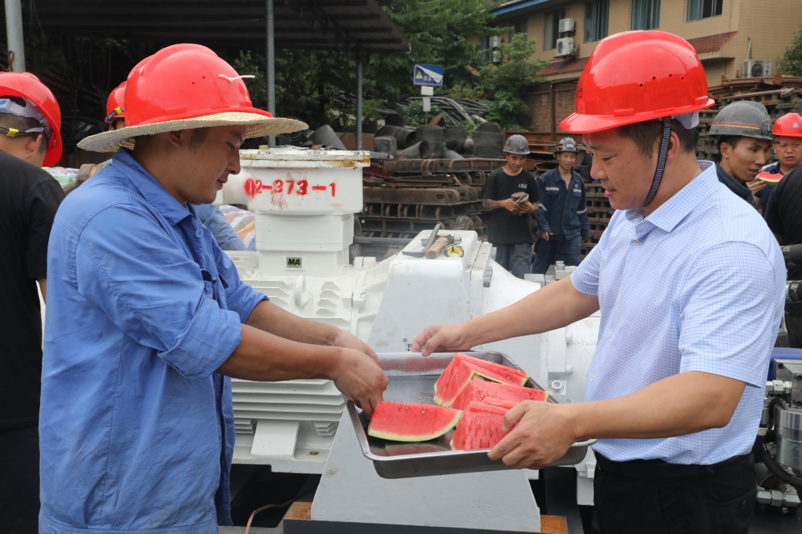 持續(xù)高溫天氣,酷熱難當(dāng),天錫井工業(yè)廣場卻是一派熱火朝天的繁忙景象。為了智能化綜采全系統(tǒng)聯(lián)合試運轉(zhuǎn)工作如期圓滿完成,盡管天氣炎熱,工人師傅們個個揮汗如雨,但仍然全力奮戰(zhàn)在工地上……7月30日,集團公司總經(jīng)理范勤英帶領(lǐng)機關(guān)三支部的黨員看望慰問作業(yè)人員,送上清涼的西瓜、礦泉水,表達(dá)組織的關(guān)心和問候,并一再盯囑相關(guān)負(fù)責(zé)同志:天氣炎熱、安裝工作緊張,更要切實做好職工的防暑降溫工作,合理安排好露天作業(yè)時間,確保地面一線作業(yè)人員的身體健康和安全。