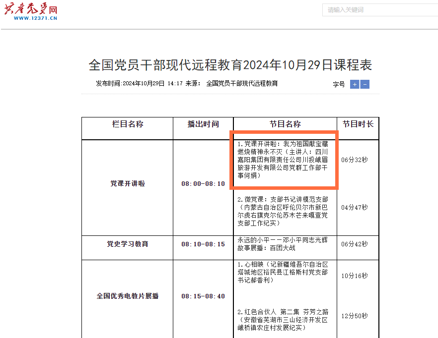 10月29日,由中共中央組織部主管、中央組織部黨員教育中心主辦的共產(chǎn)黨員網(wǎng)公布全國(guó)黨員干部現(xiàn)代遠(yuǎn)程教育課程表,集團(tuán)公司微堂課《我為祖國(guó)獻(xiàn)寶藏 燃燒精神永不滅》精彩亮相,用6分32秒的時(shí)長(zhǎng)為全國(guó)的黨員們呈現(xiàn)了難忘的一課。