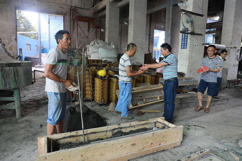 在副總經(jīng)理王維洪、袁成金的帶領(lǐng)下,機(jī)關(guān)二支部的黨員代表們帶著西瓜、礦泉水等防暑降溫物品來到機(jī)電制造維修分公司,走進(jìn)裝配車間、精工車間、鑄造車間、預(yù)制車間,看望慰問奮戰(zhàn)在高溫環(huán)境下的一線職工,為他們送去清涼與關(guān)懷。在裝配車間,副總經(jīng)理王維洪為正在辛苦工作的工人師傅們送上礦泉水,叮囑他們天氣越熱越要多喝水,同時提醒大家要合理調(diào)整作息時間,注意勞逸結(jié)合,確保安全度夏。來到精工車間,副總經(jīng)理袁成金向忙碌的工人師傅們一邊道著辛苦一邊遞上西瓜,“歇一歇,吃塊西瓜涼快一下!”關(guān)懷的話語沁人心脾,清涼傳遞到了四個車間里的每個職工身上。兩位領(lǐng)導(dǎo)要求機(jī)電分公司主管領(lǐng)導(dǎo)一定要做好防暑降溫工作,在確保職工們安全、健康的前提下組織生產(chǎn)。